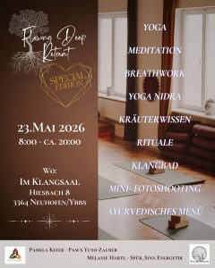 Wir fließen durch Yoga, tauchen in Breathwork ein, lassen uns von Klängen tragen und sinken im Yoga Nidra in tiefe Ruhe.