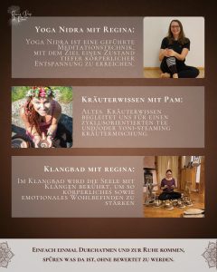 Wir fließen durch Yoga, tauchen in Breathwork ein, lassen uns von Klängen tragen und sinken im Yoga Nidra in tiefe Ruhe.